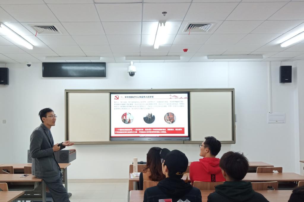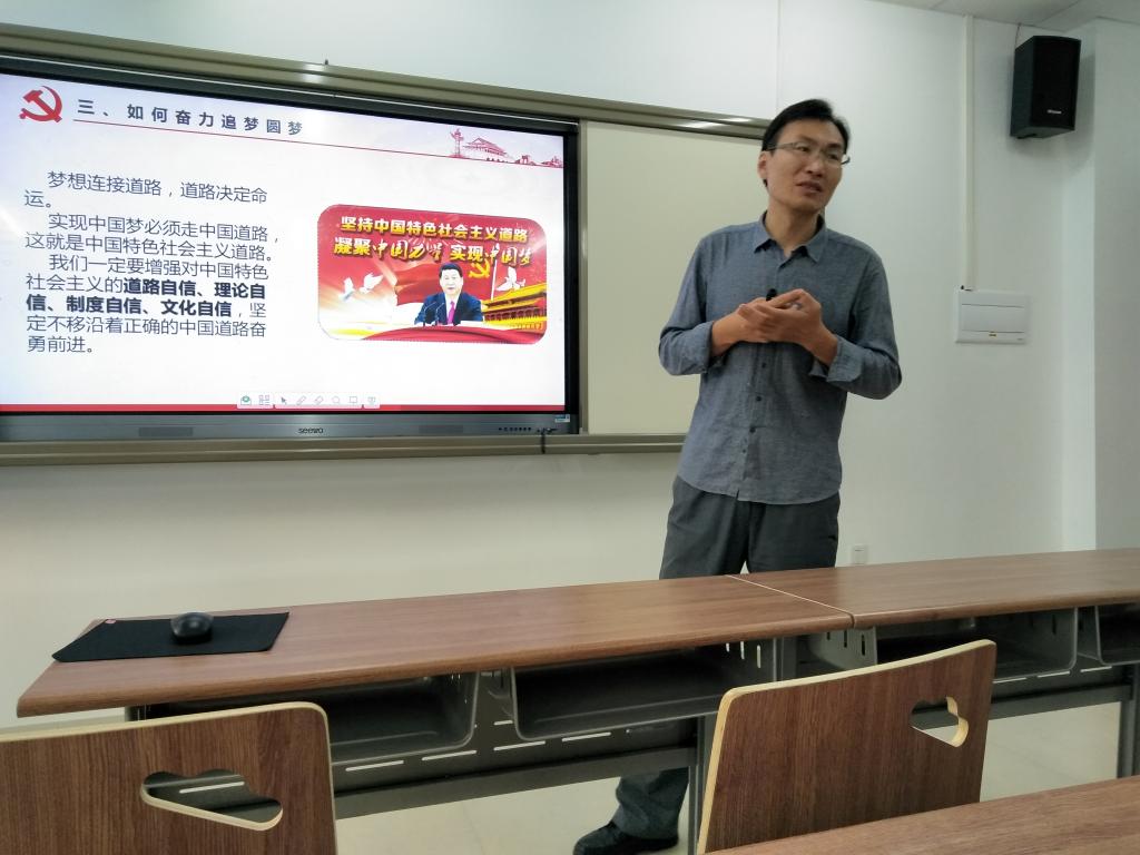 “中国梦是中国人民共同的思想追求和目标,是中华民族近代以来最伟大的梦想,在不同的时代有着不同的体现,从反抗外来侵略者的站起来,再到现在的富起来,中国共产党一直带领着广大人民不断探索,谋求发展,直到中华民族强起来。”副院长李国岗从中国梦切入主题,他以手机的更新换代为例向同学们展示了技术的进步及国家的发展。
