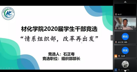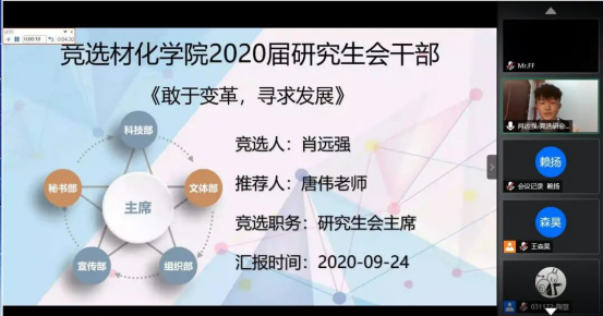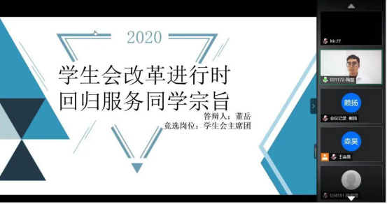 随后,在2020届学生组织主要负责人遴选答辩过程中,董岳以“学生会改革进行时,回归服务同学宗旨”为主题,从学生会如何更好地服务同学入手,阐述了对学生组织的管理和规划。