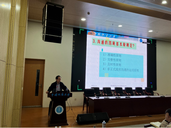 经济与管理学院帅传敏教授以《管理ABC》为题,用理论结合自身经历,为同学们讲述“如何提升管理领导能力”。帅传敏用英语向大家亲切地问候,并采用诙谐幽默的方式——“帅哥”称呼自己。欢笑声中,帅教授用自己工作以来从政府单位管理服务到高校教育学术研究的多次转型进行了自我介绍,并以管理-领导-沟通三个篇章开启讲解。帅教授用“三个和尚没水喝”的故事点明管理的重要性,他向同学们阐明“管理是艺术也是科学”的双重含义,并用工作定额的例子,向同学们讲述管理科学的诞生。帅教授向同学们介绍,领导力是一门艺术,管理者与领导者具有根本性的区别:管理者埋头拉车,正确的做事;而领导者抬头看路,做正确的事。在沟通篇的讲解中,帅教授以沟通作为根本点,用生动有趣的漫画向同学们论述沟通的重要性和沟通的技巧性。