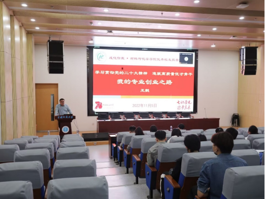王懿校友以《我的专业创业之路》为主题为同学们做专题讲座。王懿从自身经历开始讲起,告诫同学们专业知识积累的重要性,要从现在开始重视专业素养的提升,简单依托互联网的创业并不是长久之计。同时,王懿介绍了大学生创新创业的思路与方向,为同学们进行专业指导,帮助同学们加深对专业的理解,厘清创新创业方向。他说道:“创业不是一个人的事,而是一伙人的事”,鼓励同学们与同伴合作,与企业合作,从而更高效更轻松的创业。随后,王懿也指出我国在材料技术上还存在一些不足,“量大质微”仍然限制着我国材料技术的发展,他鼓励更多的年轻人加入到这一领域,共同解决国家发展中“卡脖子”的问题。最后,王懿就同学们所提出的问题进行了回答和讨论。