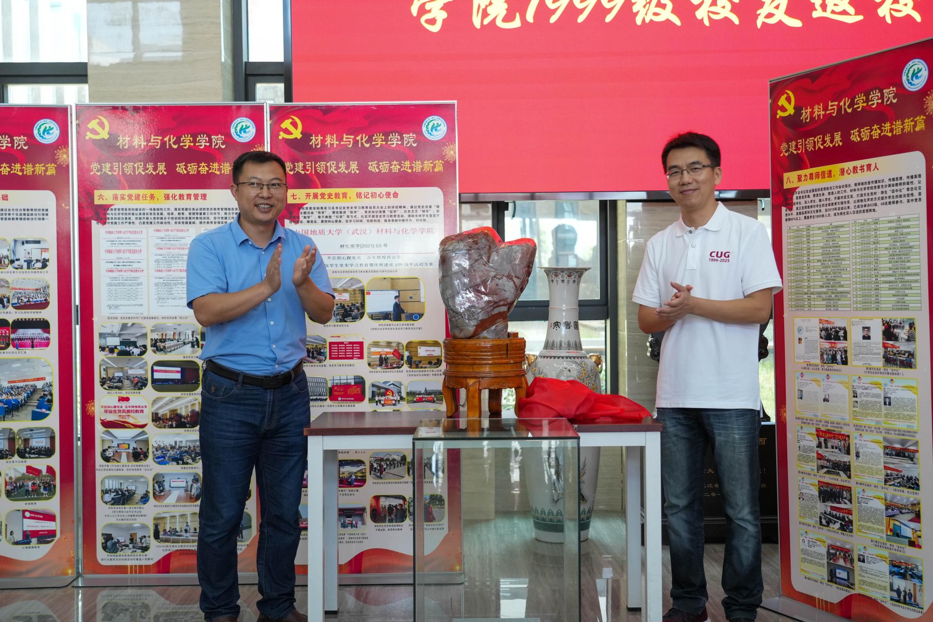 座谈会结束之后,师生一行参观了未来城校区校园,并在材化楼合影留念,院党委书记梁本哲和校友代表龚卫华为校友捐赠的纪念品“点赞石”进行揭幕。