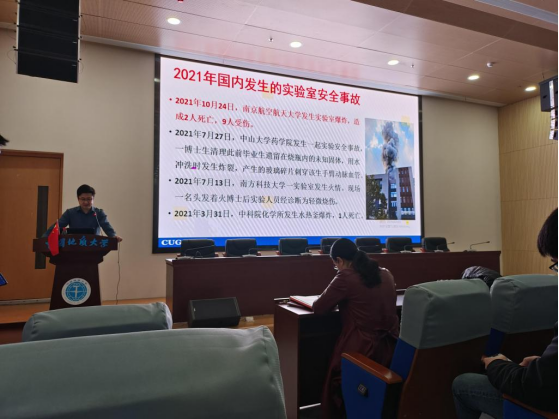 随后夏帆进行了学院实验室安全工作通报与下一步安全工作部署。他主要从实验室安全形势、学院安全巡查中发现的问题、实验室安全管理主要举措、相关案例反思四个方面展开讲述,并着重强调实验室安全是1,其它所有成绩都是0,全体教职工要把安全工作放在首位。他还举例指出了一些在安全巡查中发现的存在安全隐患的细节问题,提醒大家务必重视实验室安全,绝不能存在侥幸心理。并要求有关人员立即进行整改。