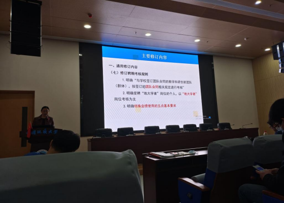 黄菊书记就学校《岗位设置管理实施方案》(2021年修订版)中关于回避制度、各级岗聘机构人员构成及议事规则、业绩成果认定、特殊业绩使用条件、流动编制和非事业编制有序衔接等有关规定、国家级项目分级划分、教师岗位职数 规定、师德师风新要求、强化思想政治工作新条款、有关教育教学实绩认定条款、代表性成果评价、重点人才绿色通道,特殊专长人才破格高聘的新规定、专职科研岗修订条款、非教师专业技术岗修订条款、管理岗高聘及考核等主要修订内容进行了详细解读。同时,她还向全体与会教师传达了学校关于严肃岗位聘用工作纪律的文件精神。