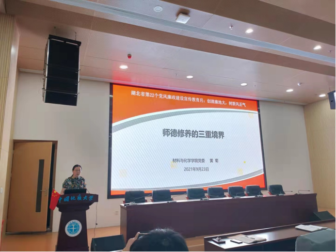 黄菊书记讲了廉政党课。她结合师德专题教育分享了对师德修养的三重境界的理解。以教育部通报的违反师德师风的五个高校教师案例为例,对照《新时代高校教师职业行为十项准则》进行了具体分析,强调教师必须严格要求自己,坚决恪守师德底线;以导师岗位职责为例,要求学院教师全面履行岗位职责,提高人才培养质量;以学院退休和在职两位优秀教师的感受为例,希望老师们用心感受,体会到职业成就感、幸福感,共同努力,创清廉地大,树新风正气。