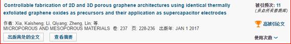 基本科学指标数据库(ESI)最新统计数据显示,我院夏开胜副教授(第一作者)、周成冈教授(通讯作者)等2017年在国际分子筛协会官方期刊《Microporous and Mesoporous Materials》上发表的学术论文“Controllable fabrication of 2D and 3D porous graphene architectures using identical thermally exfoliated graphene oxides as precursors and their application as supercapacitor electrodes”于2018年1月入选ESI全球高被引论文(前1%),果冻传媒