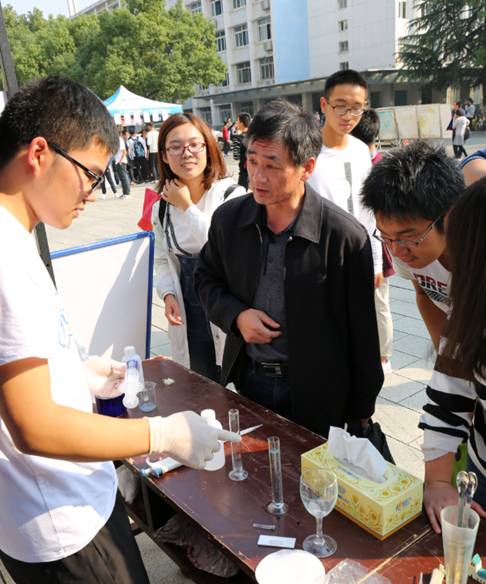 (武汉)第十二届“Chemistry Show-身边的化学”实验展演在主楼前拉开帷幕。本次展演主题为“创新成就美好生活”。校党委宣传部部长喻芒清、学生工作处处长王林清、教务处副处长吕占峰、实验室与设备管理处副处长段平忠、校团委游萌,院党委书记吴太山、党委副书记黄金波、副院长周俊、院长助理、实验教学中心主任公衍生、各团队指导老师及学工组全体老师应邀出席开幕式。17级285余名本科生及附属小学100余名中小学生参加此次展演活动。展演开幕式由院学生会主席韩冰主持。