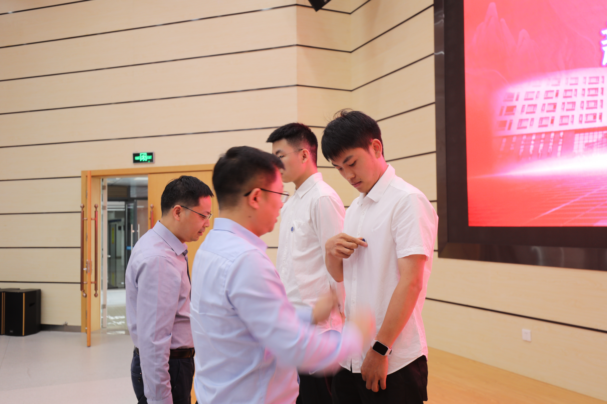 学院党委书记梁本哲、院长胡兆初为新生代表徐仕军、李彦伯佩戴校徽。