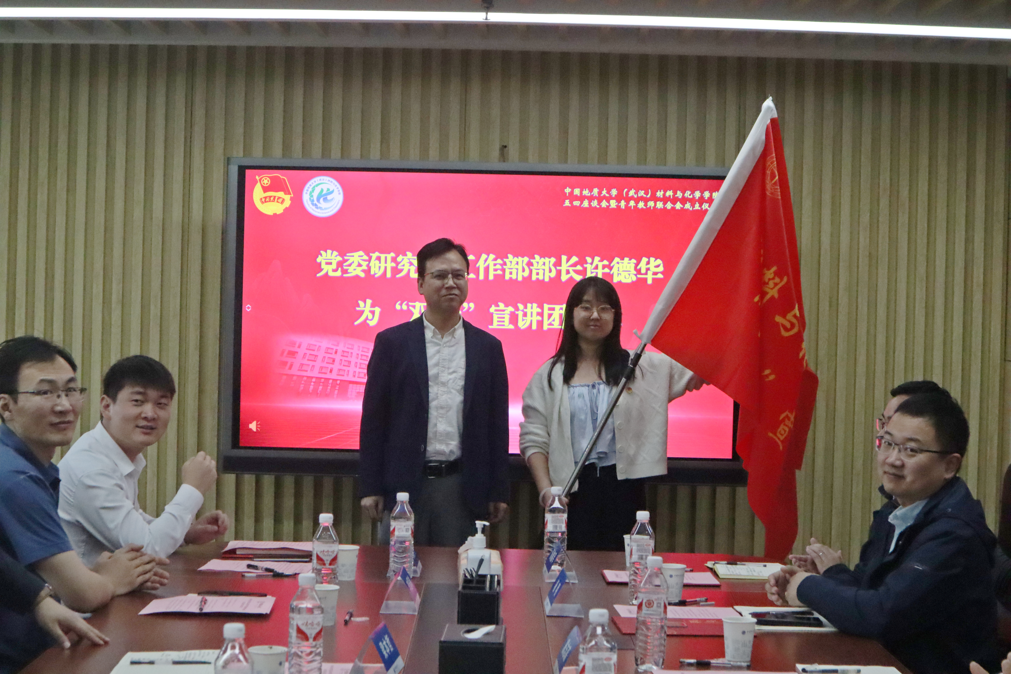 校党委研究生工作部部长许德华为“双新”宣讲团授旗,并讲话。他指出近年来果冻传媒