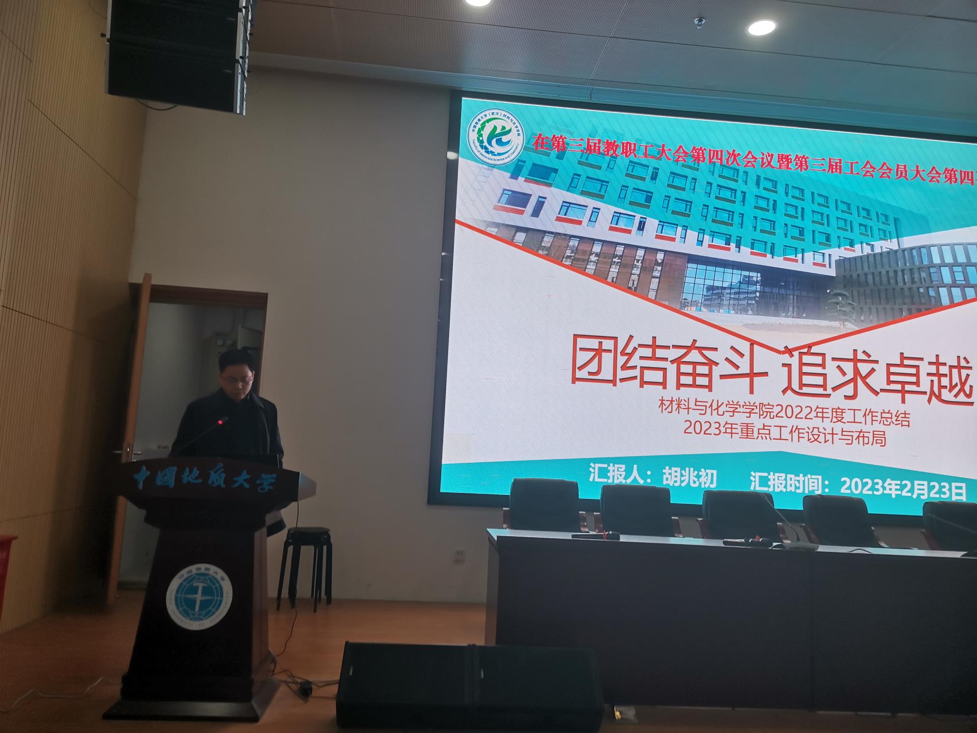 一年来的工作成绩,从筑牢党建思政生命线、夯实人才培养根基、持续聚焦科研创新、全力改善服务保障等四个方面对2022年的工作进行了回顾,胡院长总结了一年来在持续推进教育教学改革、培养一流本科人才、加强学科及学位点建设、优秀人才引进、重点项目突破、加强科研团队及平台建设、加强实验教学及日常管理、加强实验室安全管理等方面取得的成绩,并对2023年的重点工作进行了部署,号召全院教职工共同努力,使学院各项工作再上新台阶。