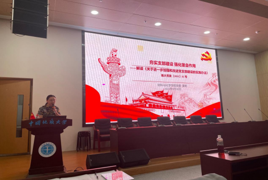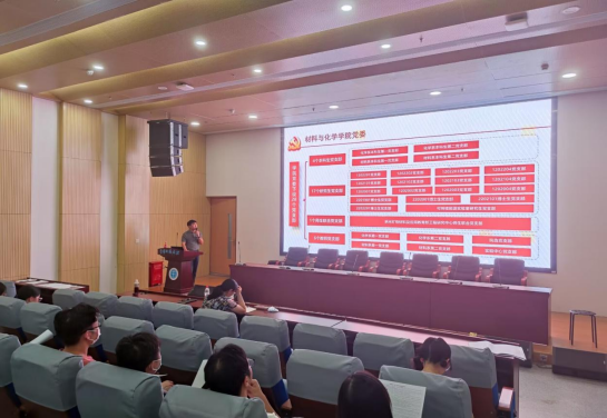 材料与化学学院党委书记黄菊老师以《夯实支部建设 强化堡垒作用》为题详细解读了学校党委《关于进一步加强和改进党支部建设的实施方法》。黄菊按照实施办法的具体要求分7个部分具体讲解,进一步明确党支部和支部委员工作职责,明晰支部建设工作制度,严格落实支部委员会建设要求,不断健全学生党支部工作体系。黄菊要求各支部以《果冻传媒